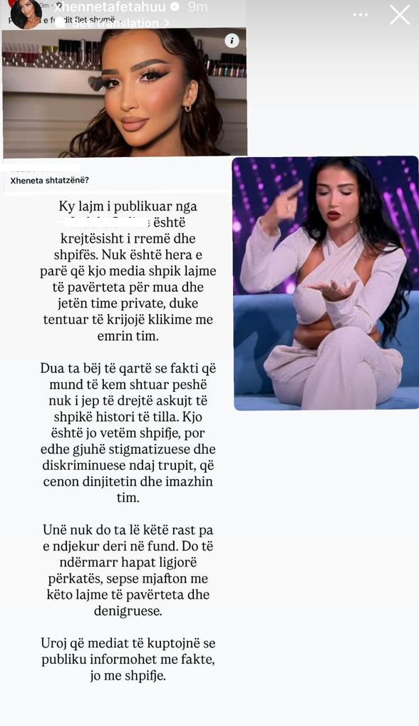 Por ajo nuk ka qëndruar në heshtje. Me një reagim të drejtpërdrejtë në Instagram, Xheneta ka zgjedhur t’i japë fund çdo spekulimi. “Nuk e di pse shpikni çdo ditë diçka të re për mua. Nuk jam shtatzënë dhe nuk ka asgjë të vërtetë në atë që po qarkullon”, shkruan ajo duke nënvizuar se vetëm ka humbur peshë kohëve të fundit.